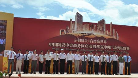 叶德林(右四)与17位行业领导、嘉宾共同启动由其发起建设的中国陶瓷中央商务区暨华夏中央广场合作项目奠基典礼上
